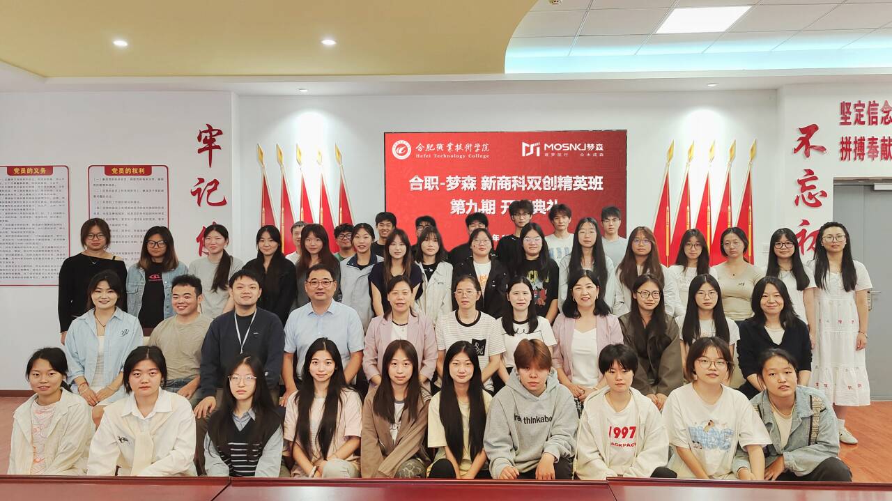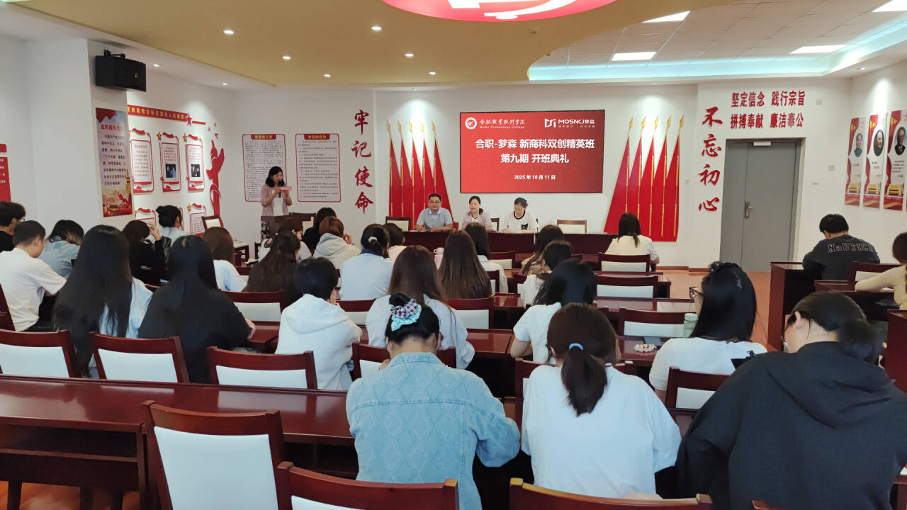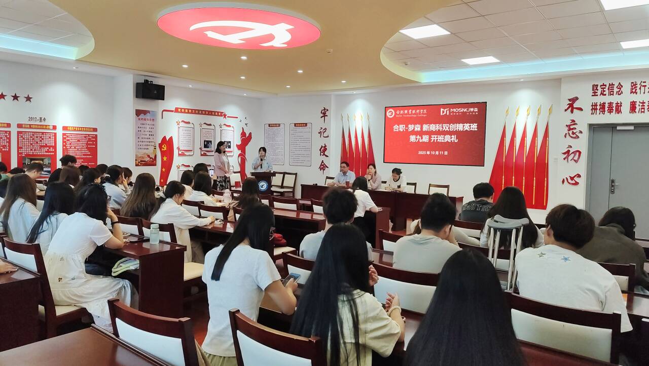 10月11日上午,世界杯体育官方网站第九期“合职-梦森”新商科双创精英班(简称“双创班”)开班仪式在经贸楼党性体验馆隆重举行。世界杯体育官方网站院长赵红、电子商务教研室主任王传芸、辅导员董如恺、袁佳庆,安徽梦森科技有限公司总经理吴捷、企业项目导师乔安,以及2024级电子商务专业37名新学员共同参加仪式。本次活动标志着新一期双创班正式启航,进一步推动校企协同育人机制落地,持续赋能新商科实战人才培养。