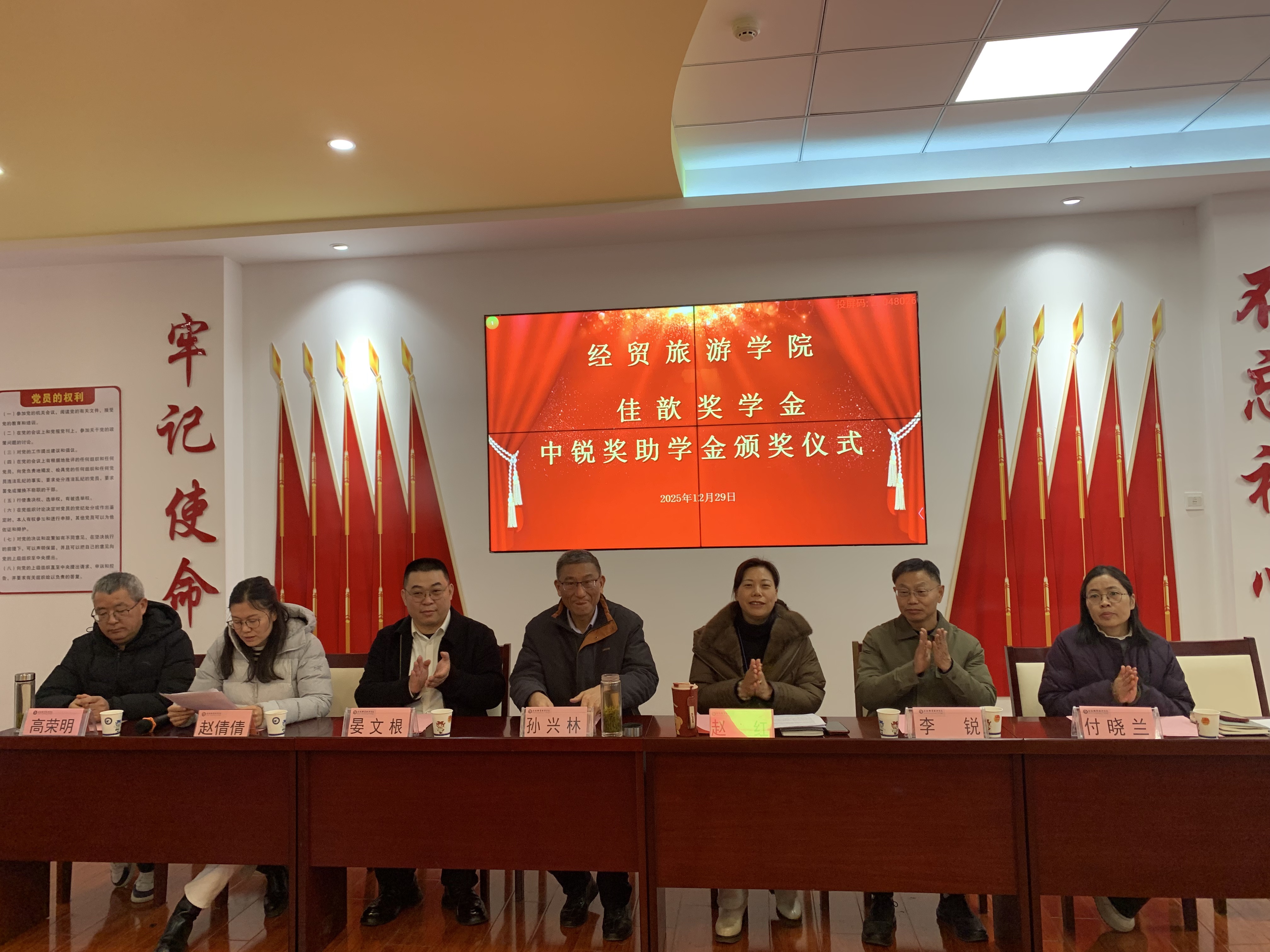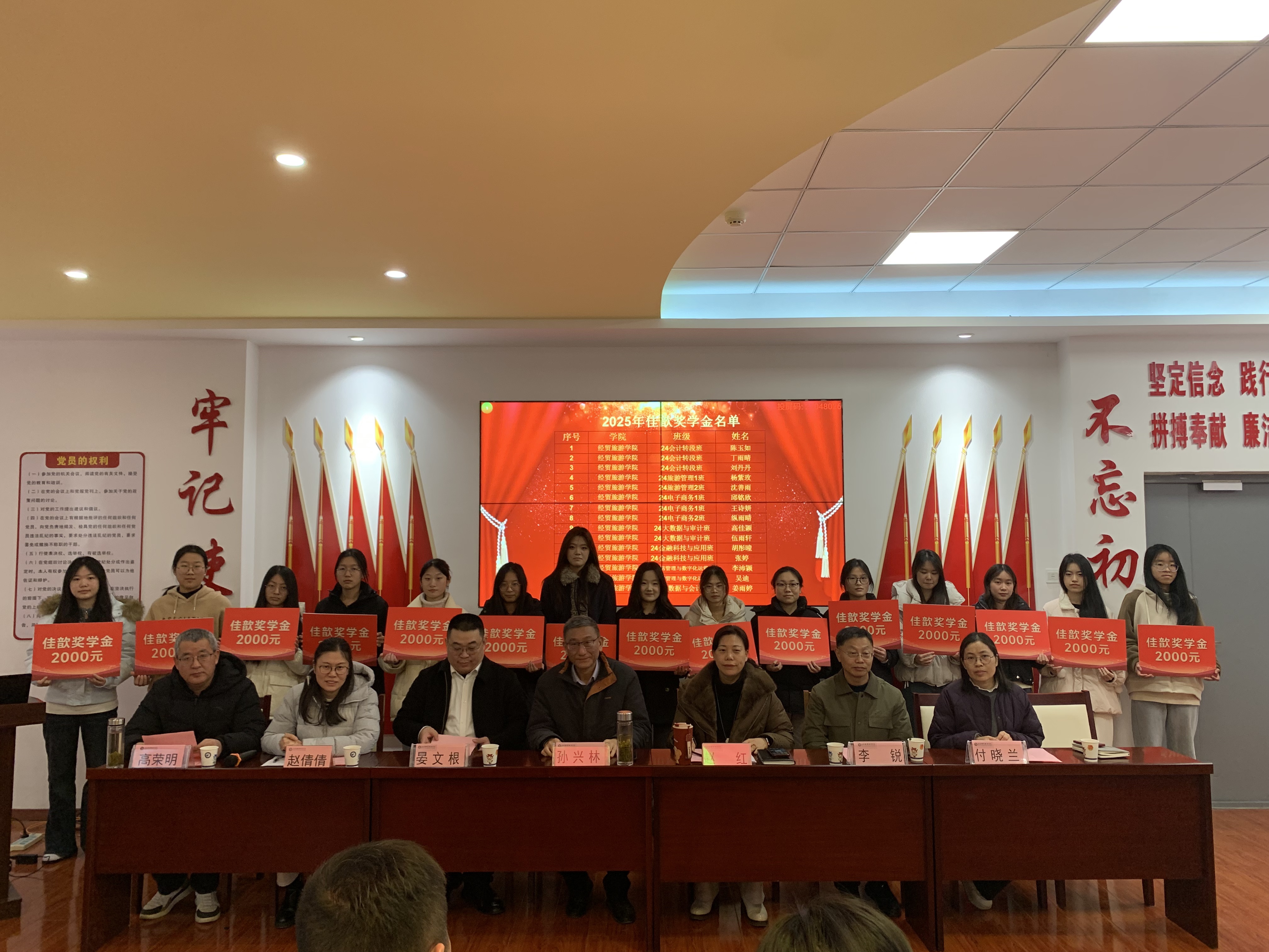 为表彰先进、激励学子勤奋进取,营造优良学风,12月29日下午,世界杯体育官方网站2025年佳歆奖学金、中锐奖助学金颁奖仪式在学院党性体验馆举行。上海佳歆房地产投资顾问有限公司企业代表晏文根总经理一行、安徽中锐税务师事务所有限责任公司李锐董事长、我校关工委主任孙兴林、世界杯体育官方网站院长赵红、党总支副书记赵倩倩、副院长付晓兰、综合办主任高荣明,辅导员代表、学生干部代表以及获奖学生出席本次仪式,仪式由赵倩倩主持。