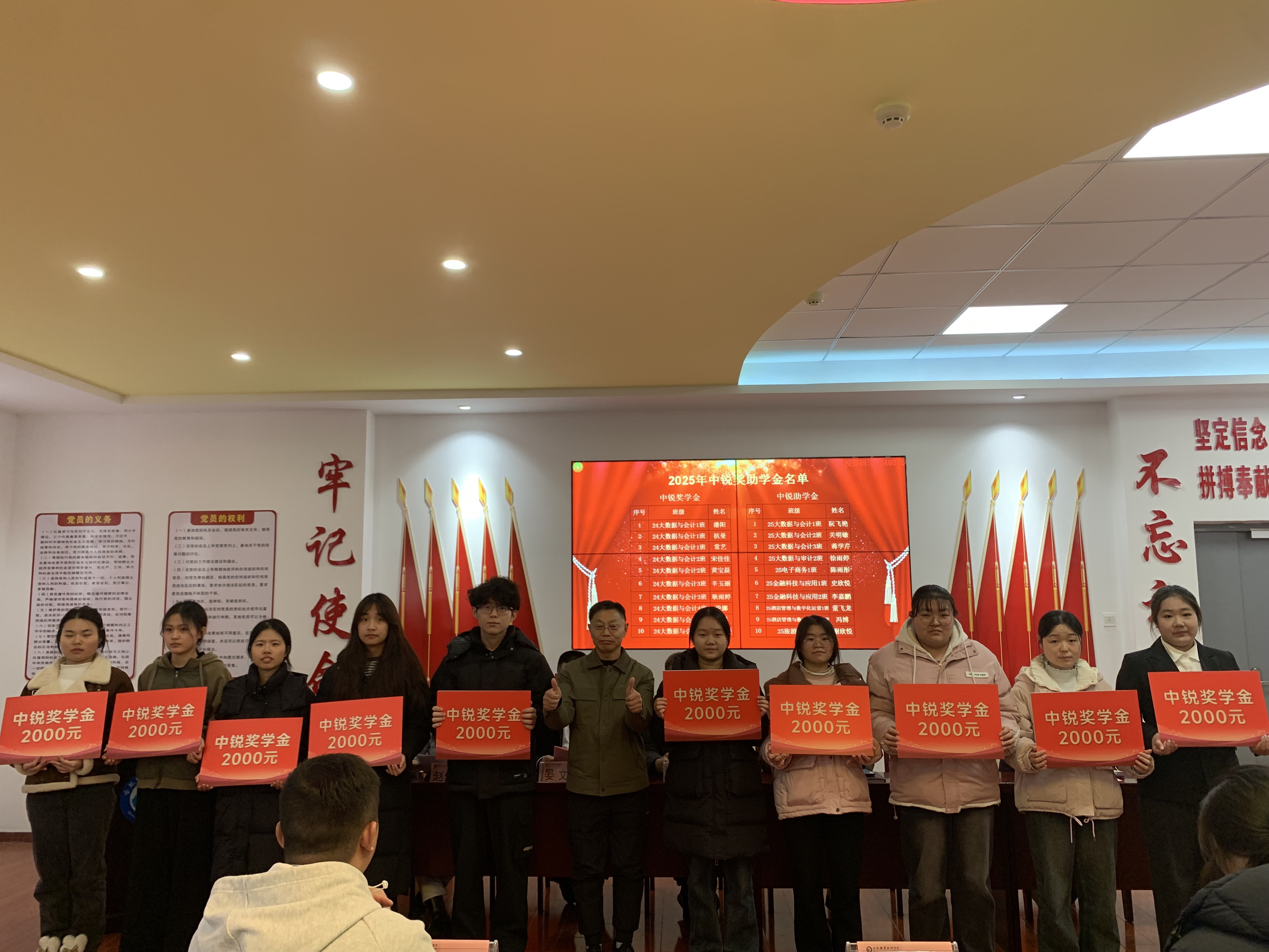 仪式伊始,赵倩倩致辞,她对佳歆奖学金创始人张启胜学长、中锐奖助学金创始人李锐董事长心系教育、捐资助学的善举表示衷心感谢,同时向获奖同学致以热烈祝贺,勉励全体学子以获奖同学和杰出校友为榜样,将企业的关怀转化为奋进的动力,努力成长为堪当民族复兴大任的专业人才。随后,参会嘉宾宣读获奖学生名单,获奖学生依次上台领奖,企业代表为他们颁发荣誉证书,台下掌声雷动,见证这一荣耀时刻。获奖学生代表也发言表示,这份荣誉既是肯定也是鞭策,未来将刻苦钻研专业知识,积极参与实践创新,以优异成绩回报社会。