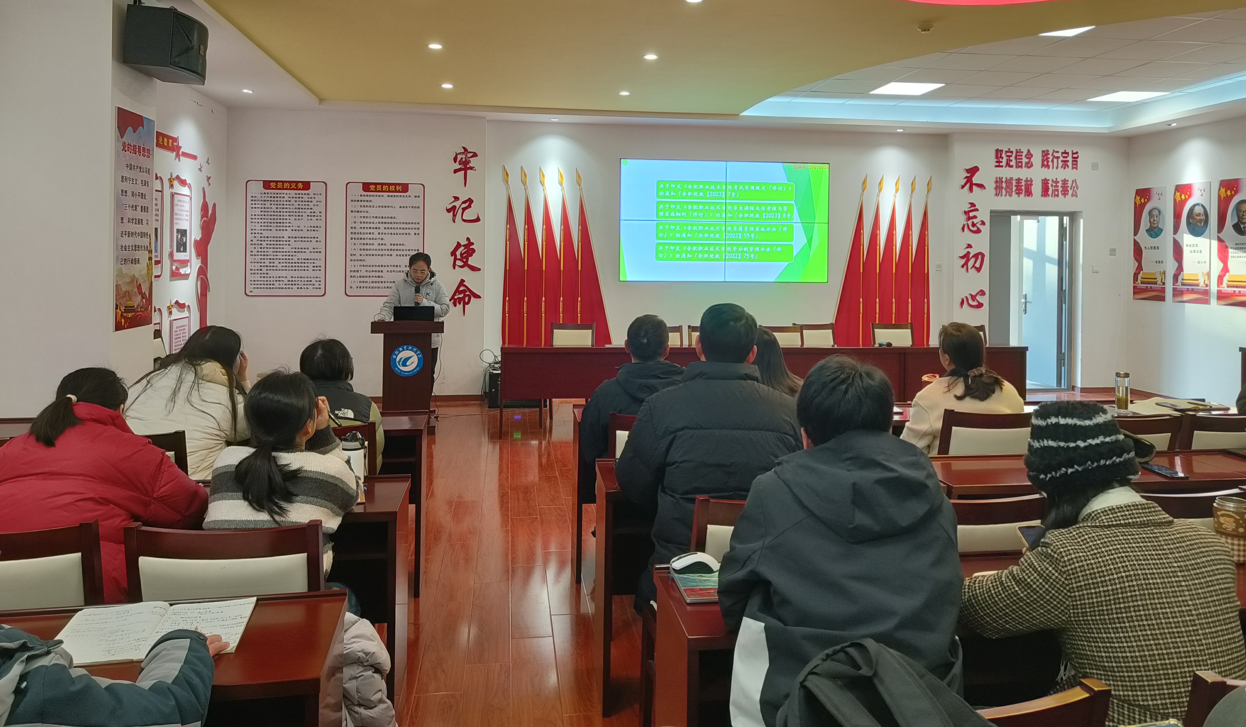 1月12日下午,世界杯体育官方网站在党性体验馆组织召开1月份政治理论学习会暨全体教职工大会,系统学习近期重要会议精神与工作部署。会议由副院长付晓兰主持,学院全体教职工参会。