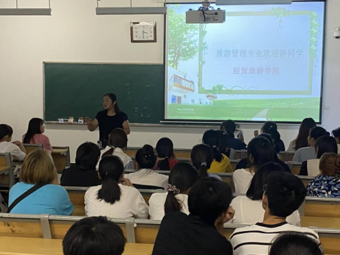在教学南楼413、401教室,朱颖教授和杨世河副教授分别为21级旅游管理专业和21级酒店管理与数字化运营专业新生作了《旅途万里伴你行,游迹千载系深情》、《雄关漫道真如铁 而今迈步从头越》的入学思想教育。朱颍老师分别从师资队伍、校内外实训基地、职业技能竞赛、学生风采、专升本情况等方面对专业情况进行详细介绍,其热情而充满亲和力的讲授,感染了在座的每一位同学,增强了同学们的自信心及对专业的无限憧憬和向往。整个过程,在场同学都听得津津有味。杨世河老师首先对酒店管理与数字化运营专业的新生做了校情介绍,然后介绍专业的课程设置、就业岗位、人才培养定位以及毕业要求等,最后帮助同学们如何规划三年的大学学习,明确目标,砥砺前行,并预祝同学们大学生期间成绩优异,成果丰硕。