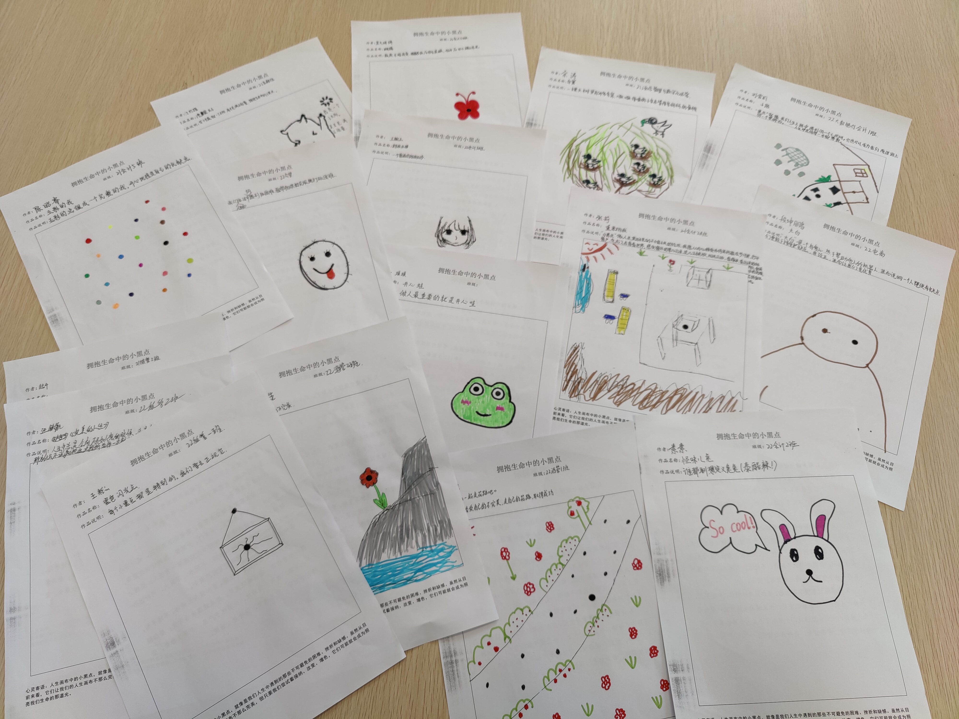 “大风吹”让同学们很快进入了状态,现场的气氛立马变得轻松且愉悦。“我的名片”要求同学们相互分享自己的昵称和个性,不仅促进了小组成员的相互了解,也加深了同学们对自我的认识。周老师与大家分享了《我就是喜欢我》的绘本故事,青蛙弗洛格的前后变化给同学们很多启示。同学们在周老师的引导下去“拥抱生命中的小黑点”,去接纳人生幕布中的小黑点,带着小黑点去发光发热。最后,“背后的力量”小组成员相互在背后的纸条上写上自己给对方的祝福。