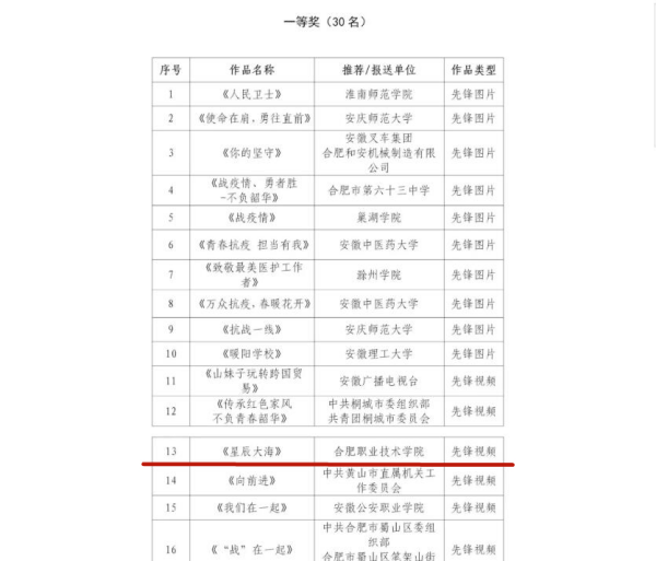 此次活动由中共安徽省委组织部、共青团安徽省委、安徽省学生联合会联合主办,活动目的是为深入学习贯彻习近平总书记关于疫情防控工作的有关重要讲话、给北京大学援鄂医疗队全体“90后”党员的回信和决战决胜脱贫攻坚座谈会上的重要讲话精神,大力弘扬五四精神,展现青年党团员不惧风雨、主动担起历史使命和政治责任,在疫情防控第一线拼搏奉献的青春风采。来自全省各单位报送的6000余件入围作品进行激烈的角逐,我院先锋视频作品《星辰大海》凭借青年学生用心的演唱、真挚的情感、朴实的内容,获得了观众和评委的青睐。