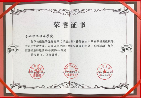 近日,由世界杯体育官方网站团总支剪辑制作、校团委选送的先锋视频作品《星辰大海》在安徽省组织的纪念“五四运动”红色信息征集活动中荣获一等奖。