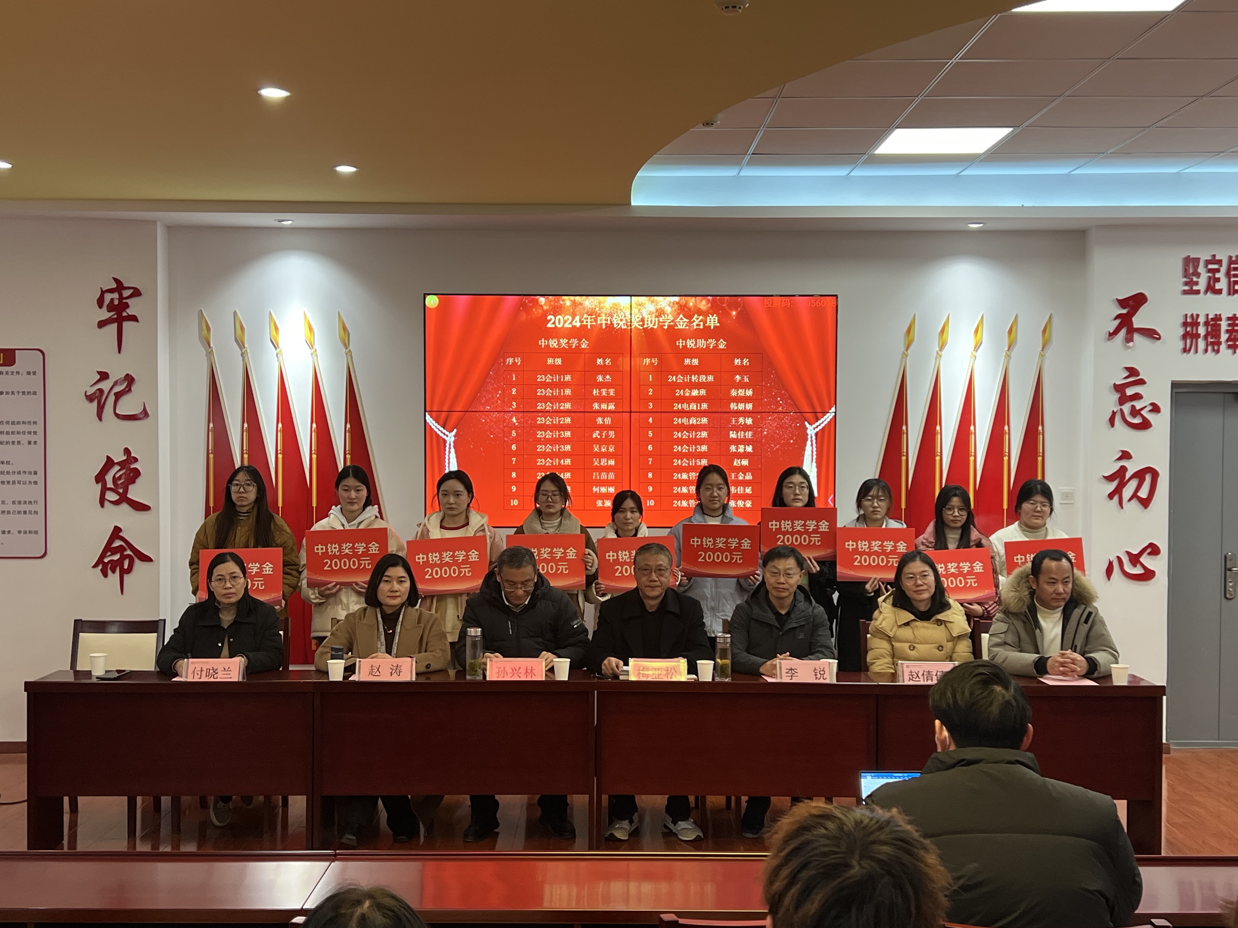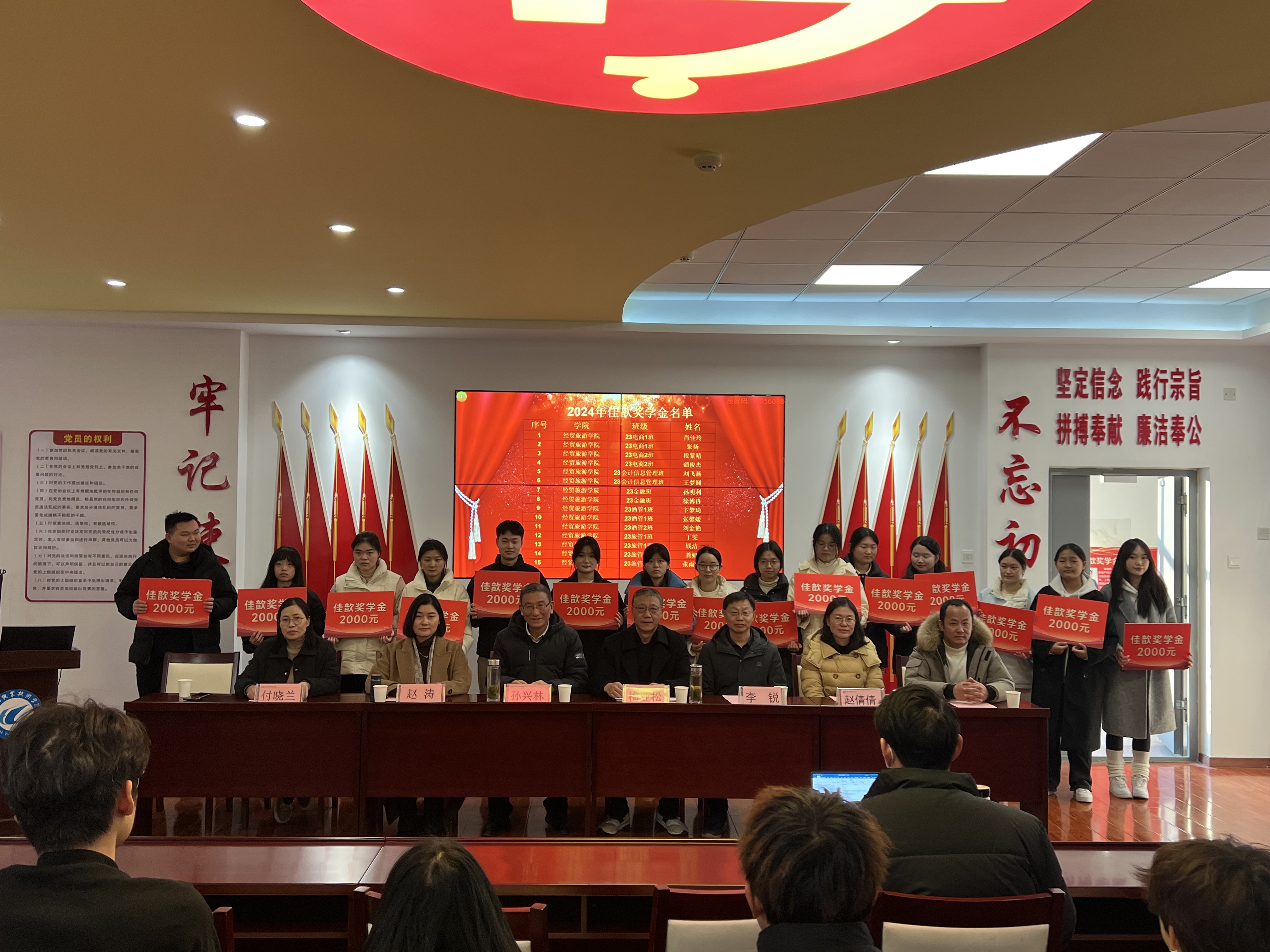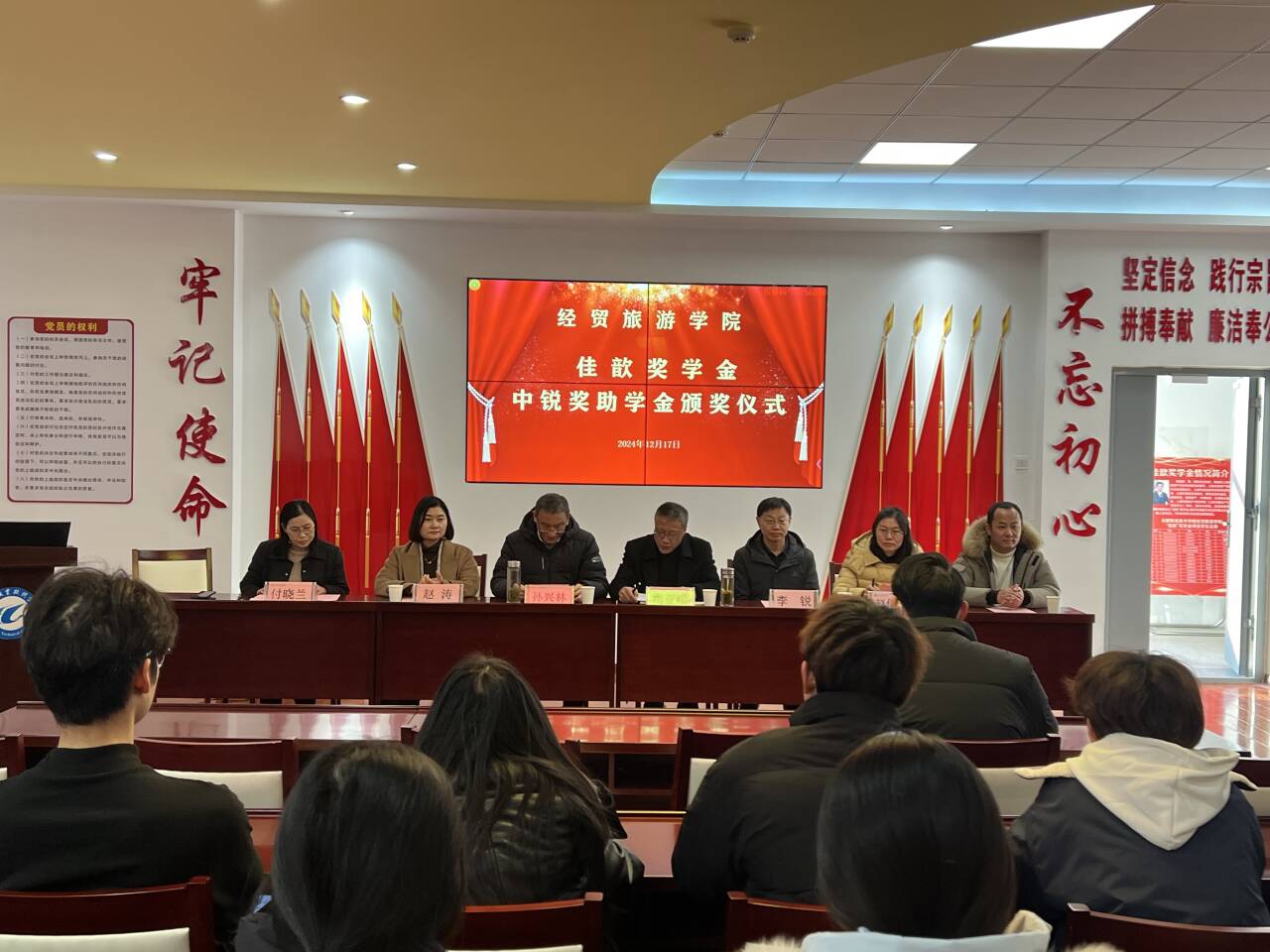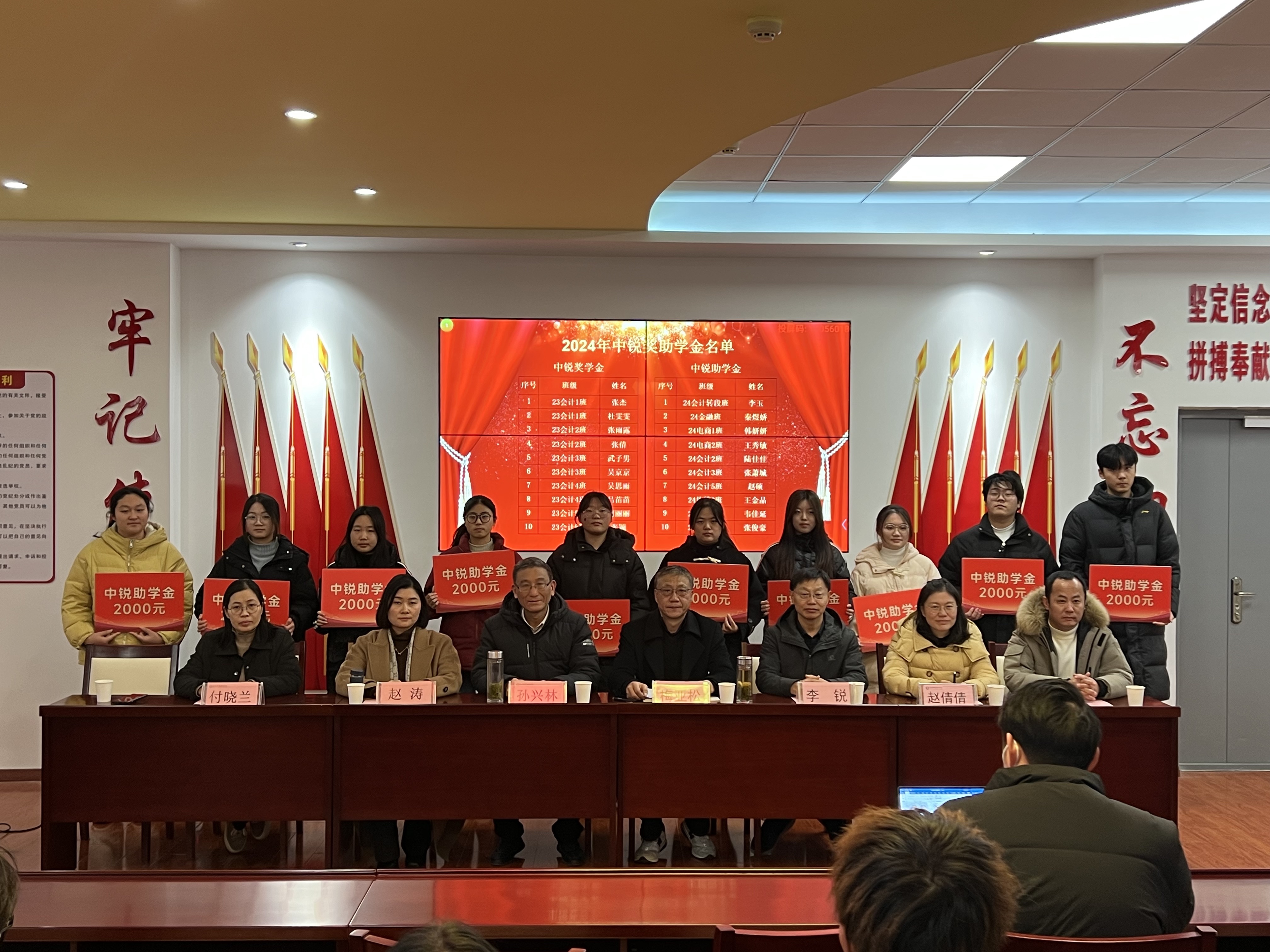 12月17日下午,世界杯体育官方网站在党性体验馆举行2024年佳歆奖学金、中锐奖助学金颁奖仪式。校关工委副主任孙兴林、安徽中锐税务师事务所有限责任公司董事长李锐、上海佳歆房地产投资顾问有限公司总经理赵涛、学院党政领导班子、学院学管办全体辅导员、全体获奖学生和部分学生代表参加了此次颁奖仪式。颁奖仪式由学院党总支书记梅亚松主持。