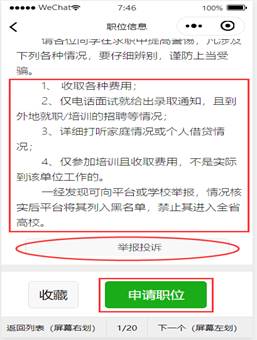 2、在职位列表中选择职位,可在线申请该职位。若在求职过程中发现单位有欺诈行为,可向平台举报。