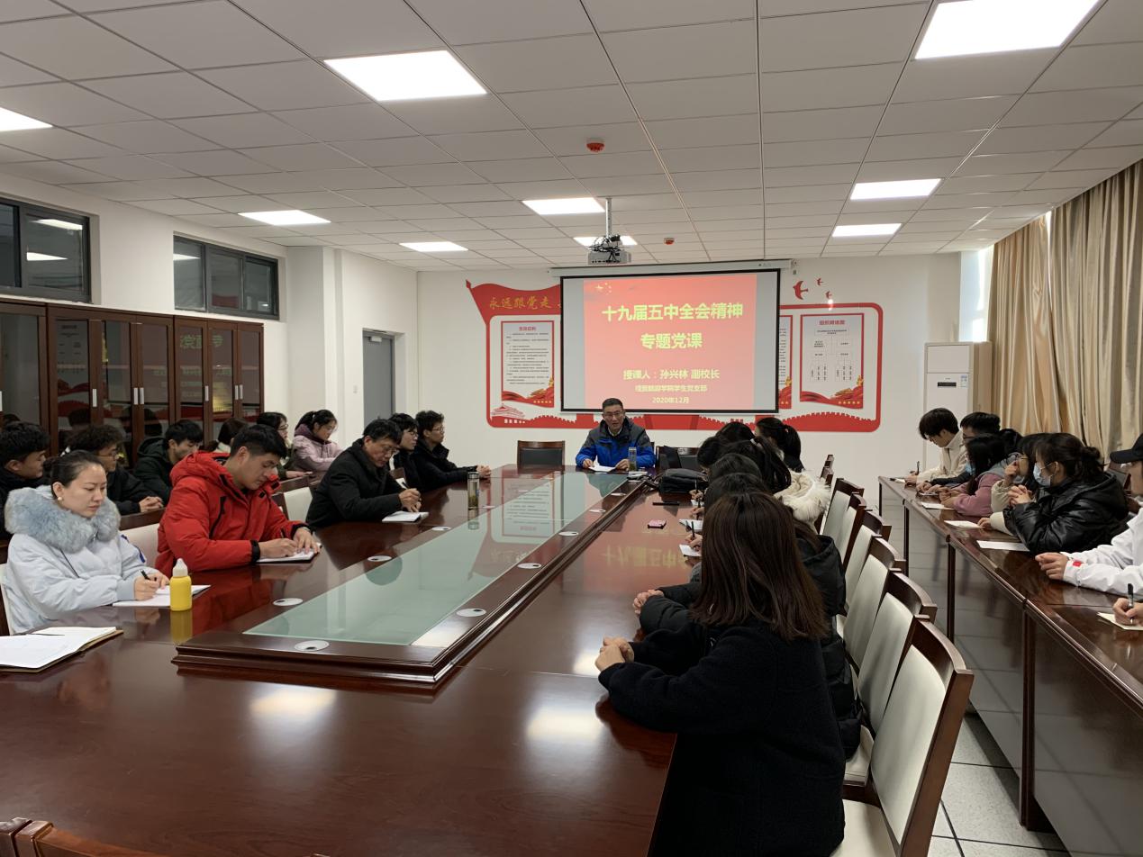 为深入学习党的十九届五中全会精神,深刻理解新时代青年大学生的使命和担当,提高广大师生党员的党性修养,12月15日下午,副校长孙兴林到世界杯体育官方网站学生党支部作题为《深刻认识党的十九届五中全会精神的重大意义,承担起新时代的使命和担当》的专题党课。世界杯体育官方网站学生党支部全体在校师生党员和部分入党积极分子参加了本次党课学习,会议由世界杯体育官方网站党总支书记梅亚松主持。