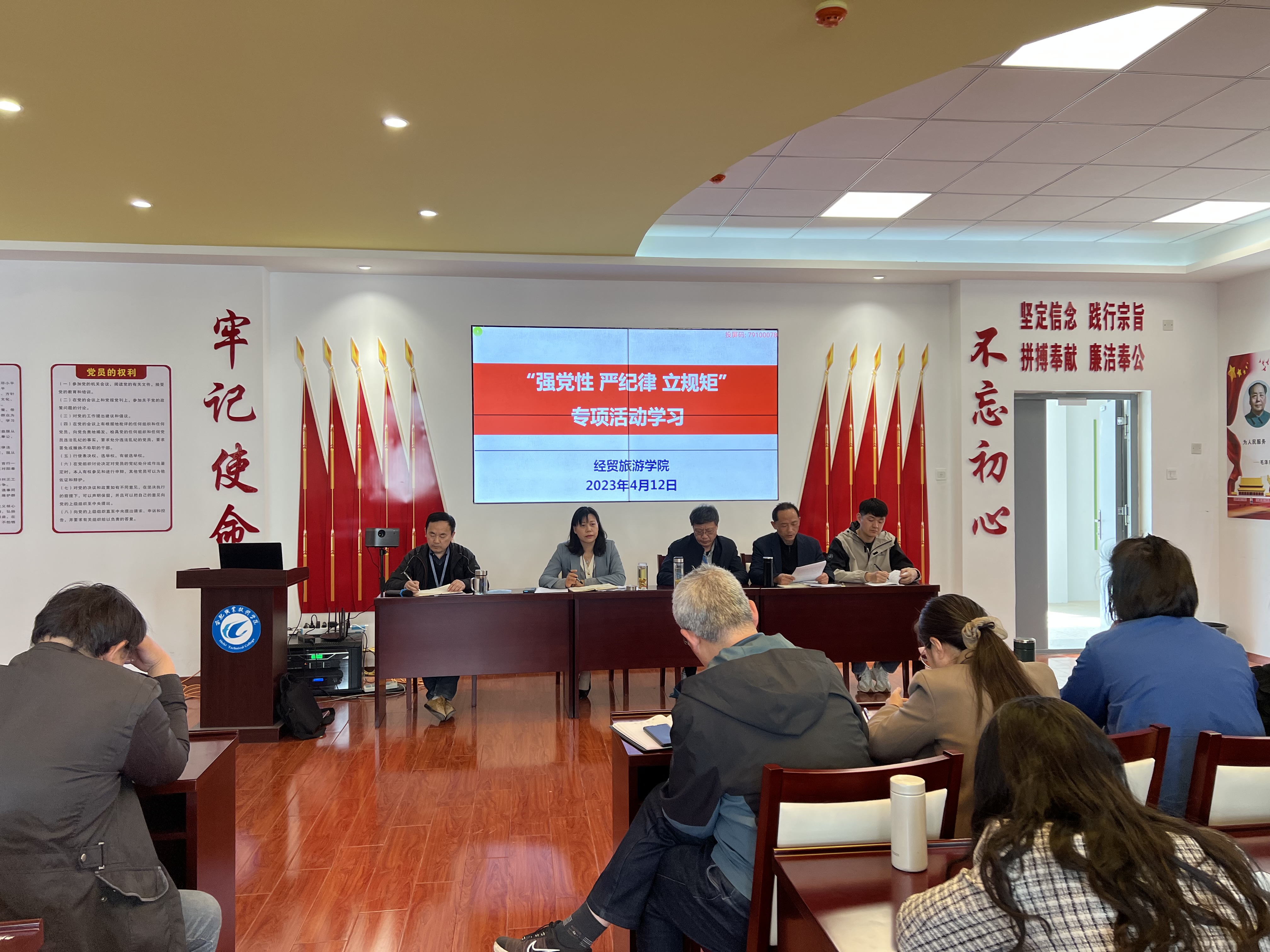 会上,院长赵红领学习近平总书记在全国两会期间的重要讲话精神;党总支委员王明明带领大家学习安徽省委书记韩俊在全省传达学习全国两会精神大会上的重要讲话内容;党总支副书记刘圣春传达合肥市教育局党委开展“强党性 严纪律 立规矩”专项活动工作方案精神;梅亚松通报近年来全全省高校腐败案例,以案示警。