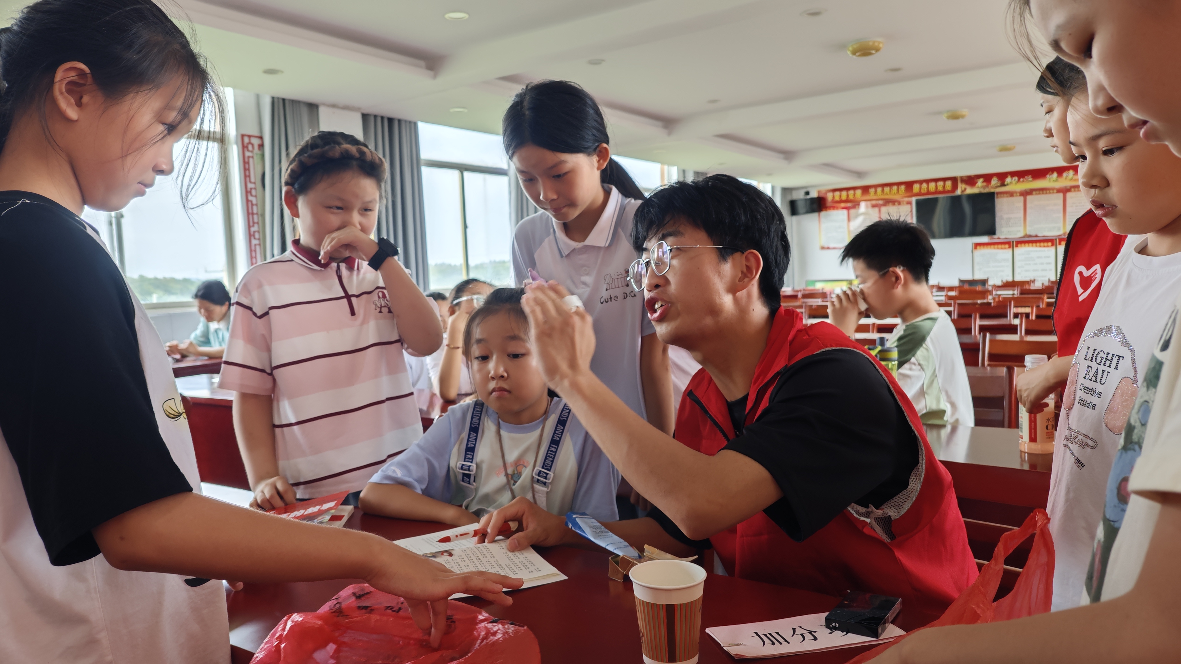 6月28日,《我眼中的家乡》主题绘画活动正式在大石乡人民政府展开,孩子们用稚嫩的小手勾勒青山绿水、温馨家园与连绵的瓜蒌田,童真跃然纸上。课后,实践团队员与孩子们奔向承载家乡特色的瓜蒌田进行合影留念,欢笑声回荡于绿野之间。下午的知识竞赛紧张激烈,孩子们:古诗默写笔锋沉着,数学逻辑争分夺秒,百科问答踊跃争先……,同时,实践团也为孩子们发放文具与爱心礼包,激励他们在未来的学习道路上永远热情。随后,指导老师方悦老师以生动的讲解带领孩子们探索英语音标世界,为未来孩子们的英语学习点亮一盏明灯。