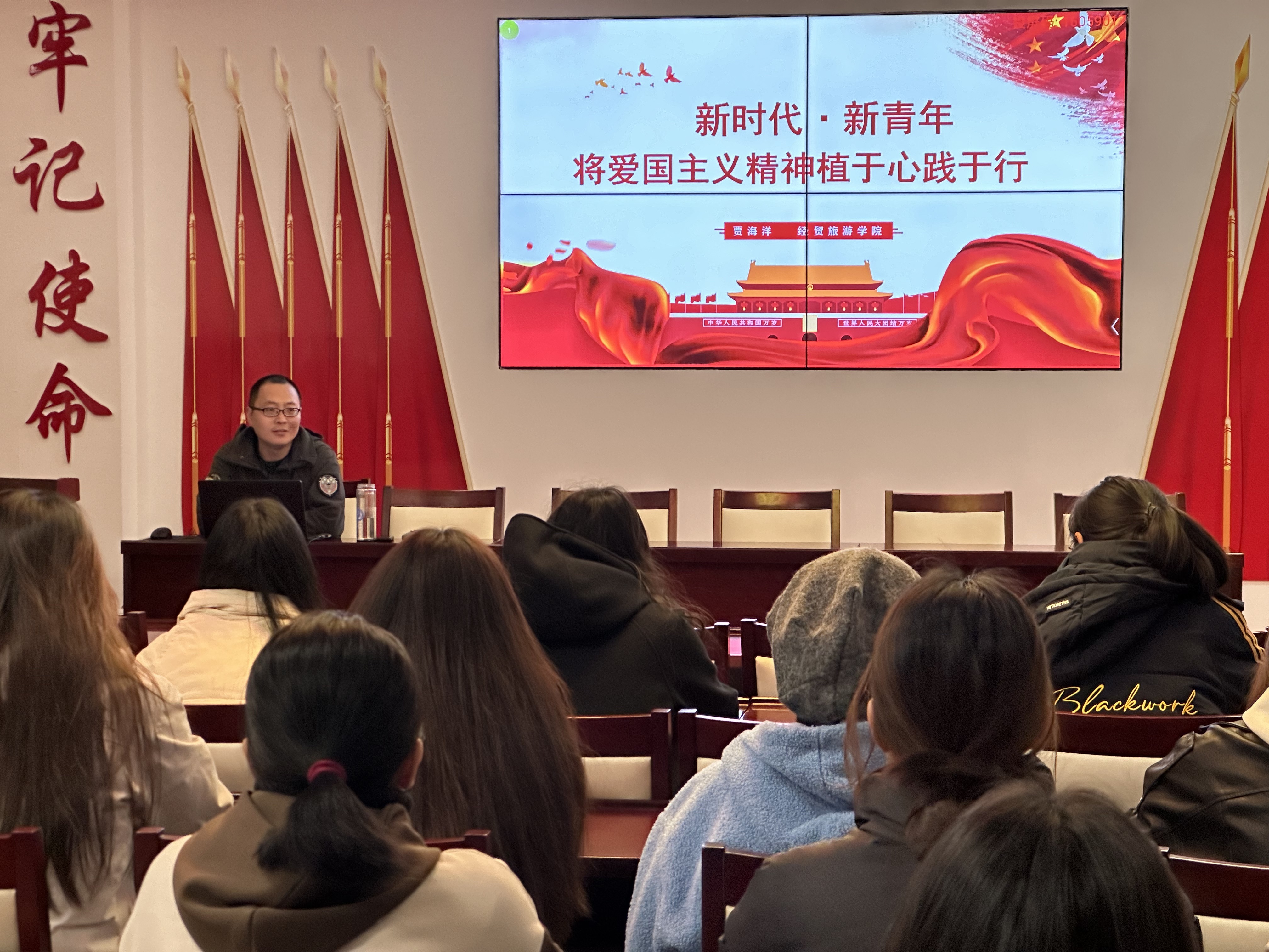 理论领航 爱国铸魂 11月20日在经贸楼党性体验馆,由世界杯体育官方网站专职组织员贾海洋老师以“新时代 新青年 将爱国主义精神植于心践于行”为主题,以当前世界局势做切入点,聚焦新时代爱国主义精神的核心内涵与实践路径,从理论阐释、情感表达、行动体现三个维度,生动解读青年如何将爱国情、强国志、报国行融入个人发展与成长历程。贾老师通过社团活动展示、爱国实践分享,引导大家以节庆纪念日契机,在日常生活、网络交流、活动开展中践行爱国主义精神,在专业学习、志愿服务、社会实践中勇担青春使命。