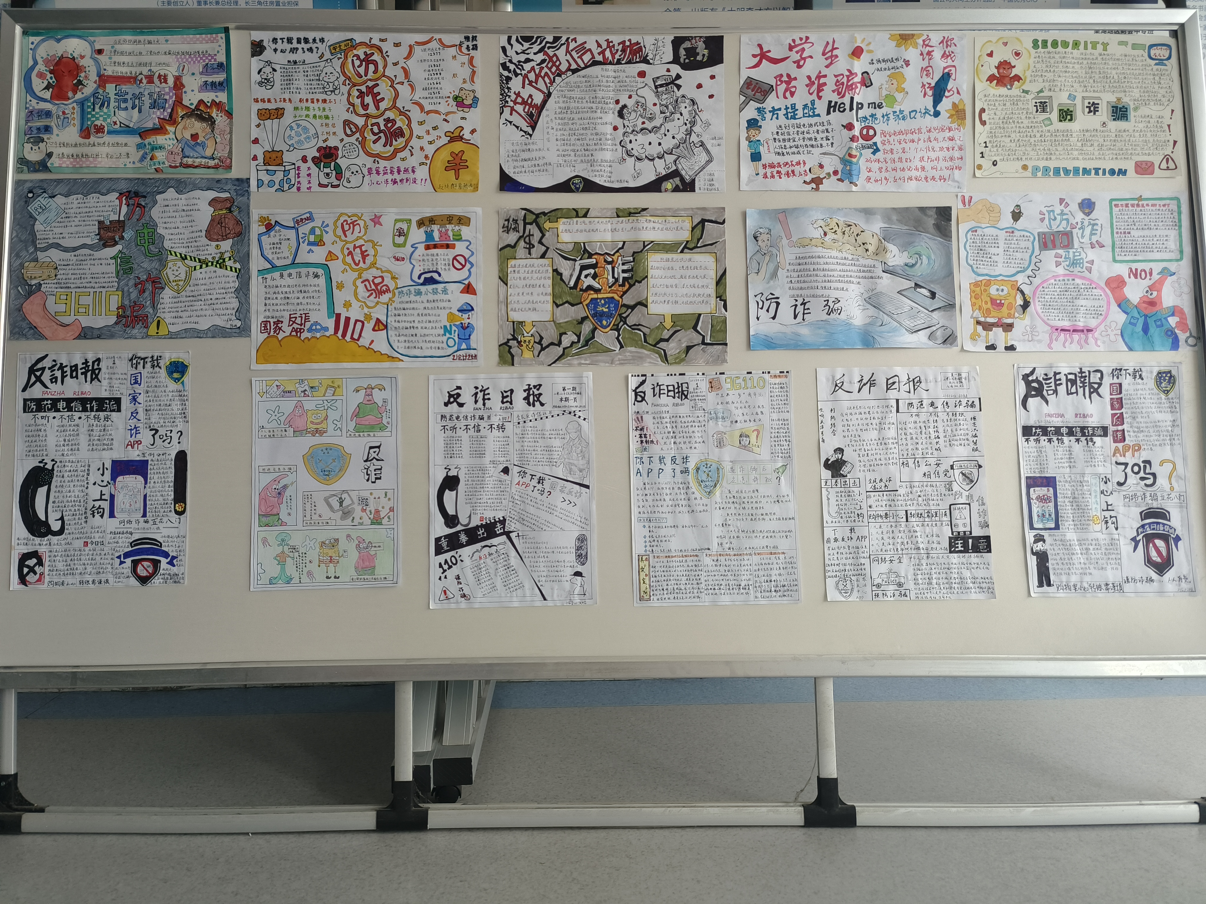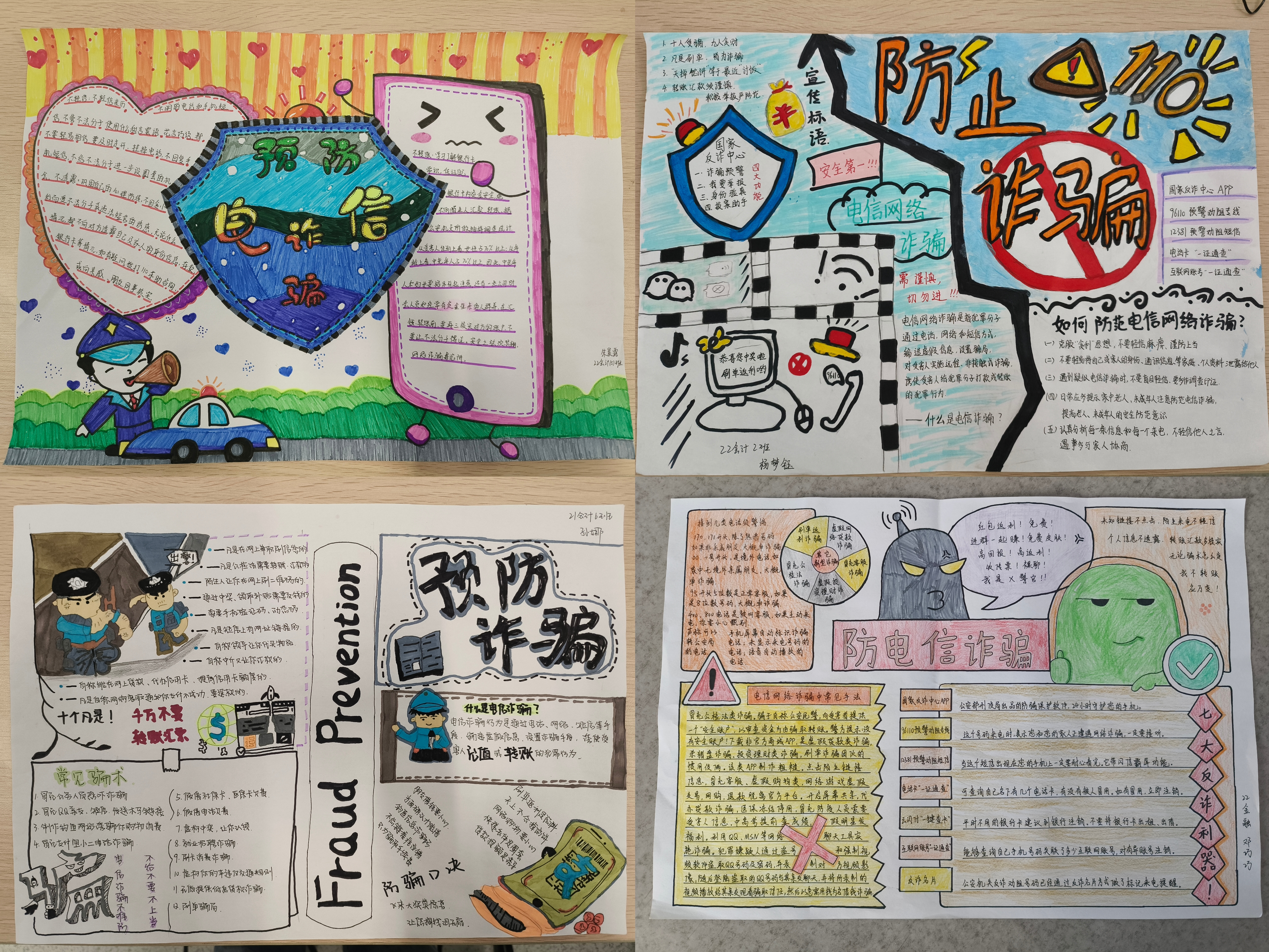 各班同学积极参加活动,主题明确、设计新颖、图文并茂,紧紧围绕学校、社会、生活等方面可能出现的诈骗形式进行创作。参赛作品详细分析了典型诈骗案例,形象地介绍了网络诈骗的危害以及如何防范电信网络诈骗,直观的将防诈骗理念融入到手抄报中,提高了同学们预防诈骗的能力。