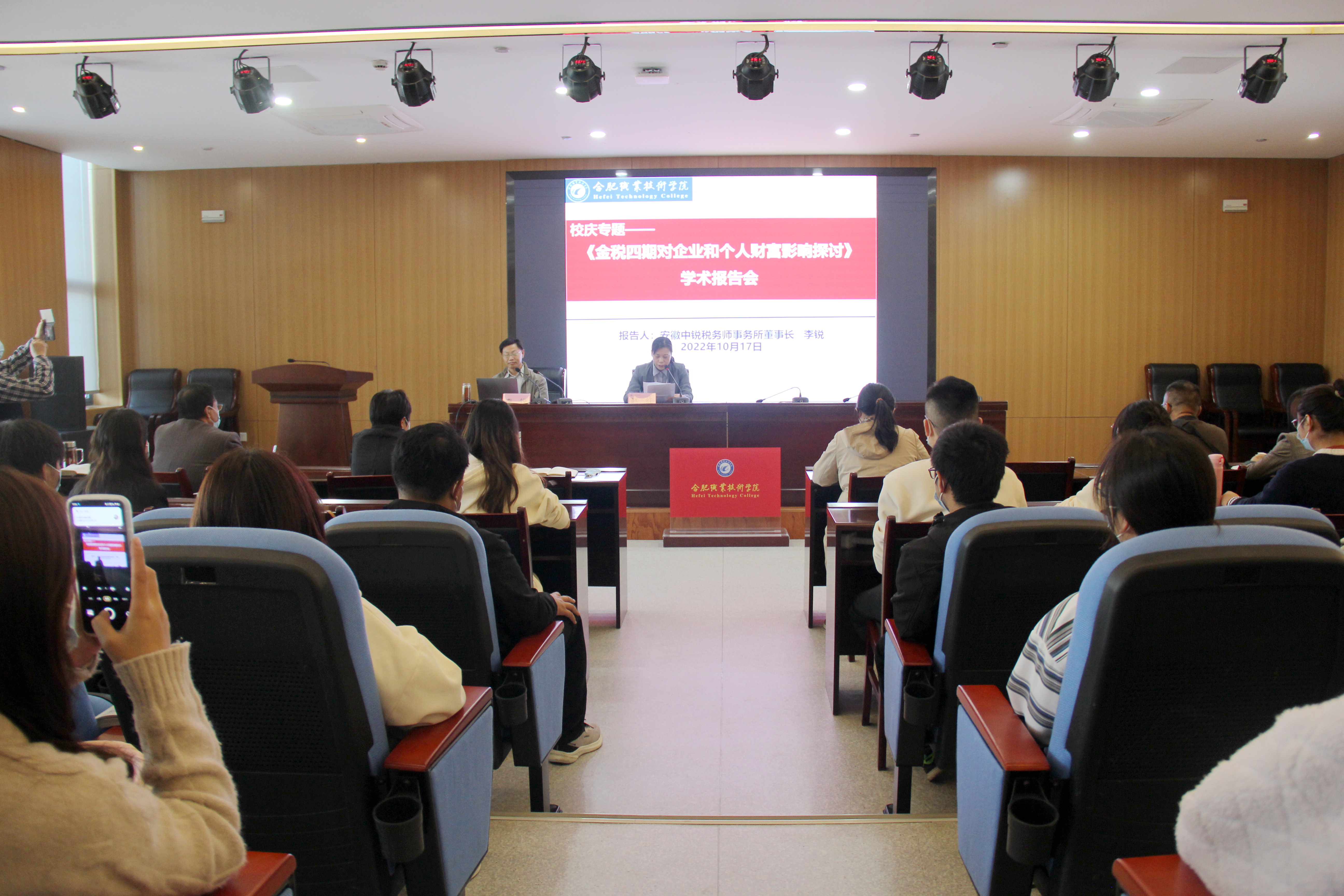 为庆祝二十周年校庆,营造浓厚的校园学术氛围,使我校师生了解金税四期对企业和个人财富影响,10月17日下午2点,由世界杯体育官方网站举办的题为“金税四期对企业和个人财富影响探讨”的学术报告在汇心湖校区图书馆一楼报告厅召开。此次学术报告特邀主讲人是我校杰出校友,85财校班学子,安徽中锐税务师事务所董事长李锐。李锐董事长是安徽财经大学硕士生导师,注册会计师、注册资产评估师、税务师、国际内部审计师、澳大利亚公共会计师(MIPA),担任中国注册税务师协会常务理事、安徽省注册税务师协会法人兼副会长、安徽省总会计师协会副会长,并担任多家上市公司独立董事。