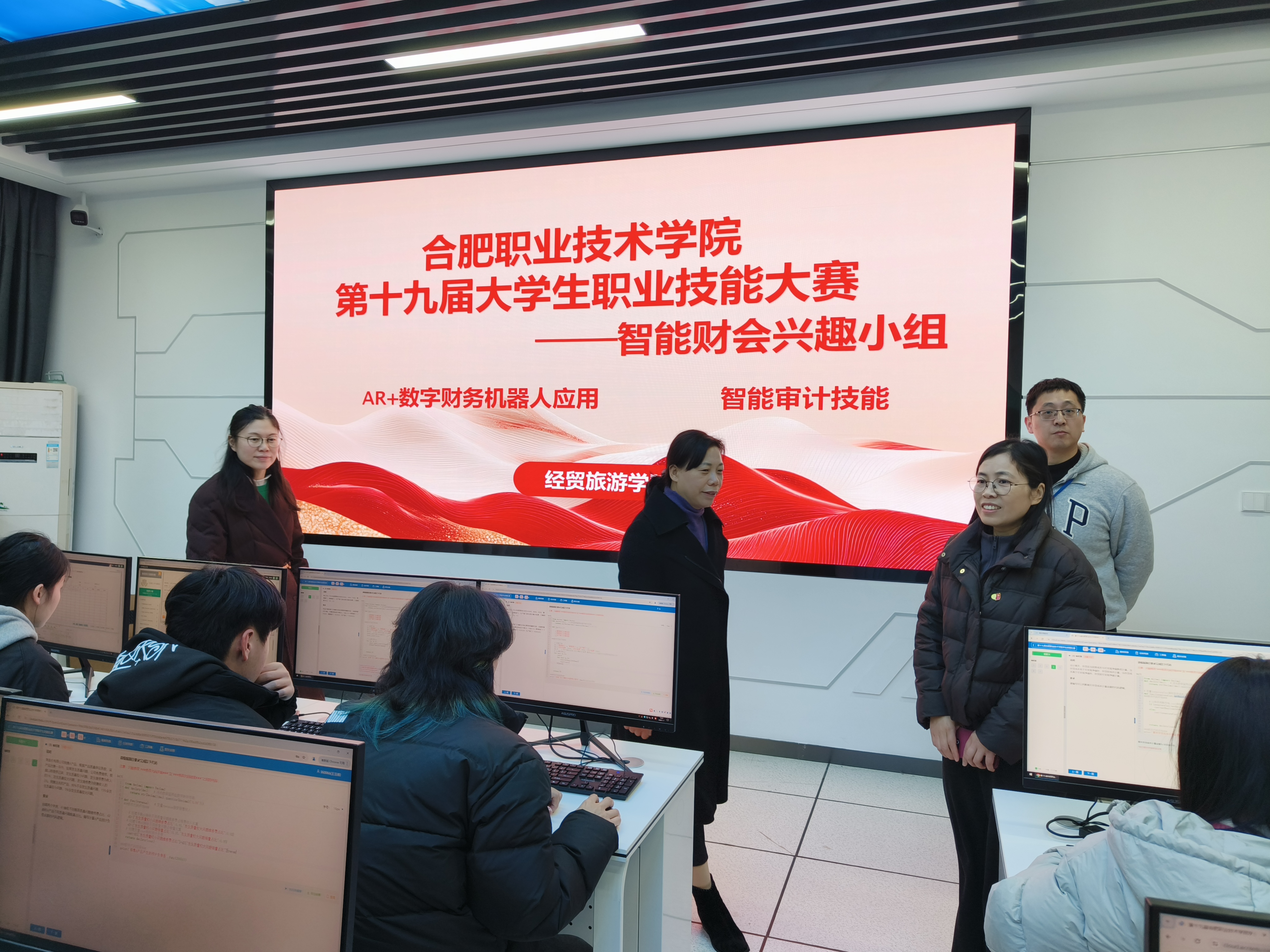 本次校赛涵盖多个专业领域核心赛项,学院针对性组建五大技能兴趣小组精准对应:金融兴趣小组承接智慧金融赛项;数智财税兴趣小组负责企业经营沙盘模拟、会计实务、纳税申报与风险识别赛项;智能财会兴趣小组对应AR+数字财务机器人应用、智能审计技能赛项;旅游管理兴趣小组承担导游服务赛项;电子商务兴趣小组聚焦数字贸易与跨境电商综合技能赛项。大赛现场氛围紧张热烈,各赛项同步开展、有序推进。参赛选手精神饱满、沉着应战,凭借扎实的专业功底和娴熟的实操技能展开激烈角逐,充分展现出良好的专业素养和竞技风采。