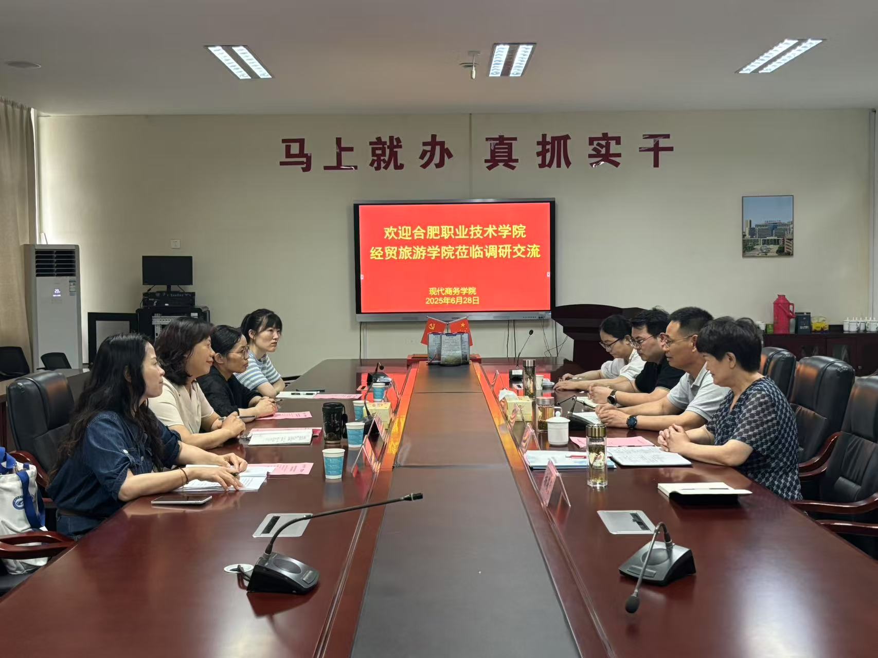 为学习借鉴本科层次职业教育建设的先进经验,加快推进学院内涵式发展与提升,2025年6月28日,我校世界杯体育官方网站院长赵红率队,副院长付晓兰、会计教研室主任王欢、副主任屠欢一行四人,专程赴安徽职业技术大学现代商务学院进行“升本经验学习”专题调研。此次调研受到安徽职业技术大学现代商务学院的热情接待。