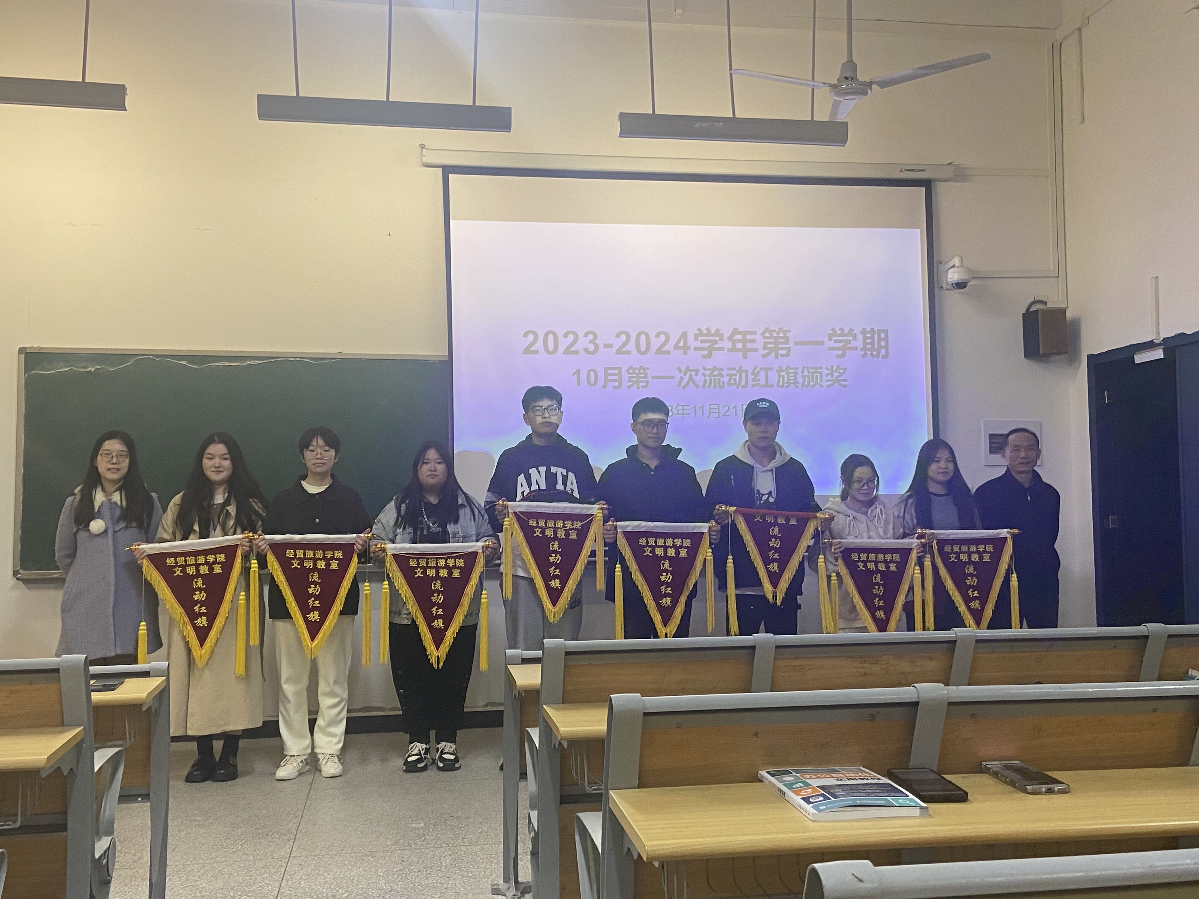 经过自管委客观公正的评比,23级会计2班、会计1班、酒管2班、酒管1班、金融班、旅管1班、电商1班和会计4班荣获新一届“文明教室流动红旗”。