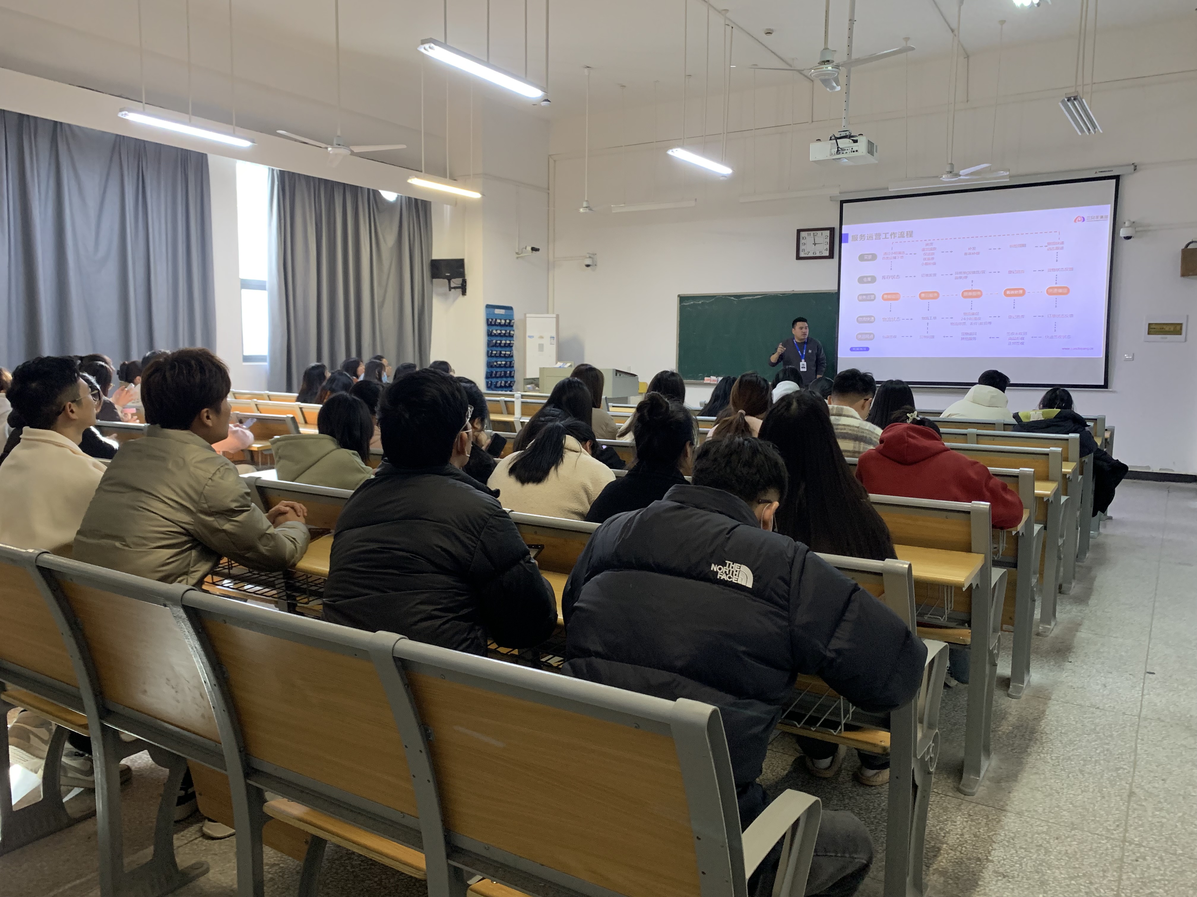 宣讲会会上,参会企业人事总监通过PPT展示、现场互动交流等方式向同学们介绍公司概况、岗位职责、岗位需求、薪资待遇、公司福利、食宿安排、职位晋升、保险补贴等相关情况,并就学生的疑问和需求做出详细的解答。此外,参会企业人事总监还向同学们分享了自己的职场工作经验,为学生在职业目标确立、人际沟通知识、专业素养知识、寻找工作心态调整等方面提供了宝贵的建议。
